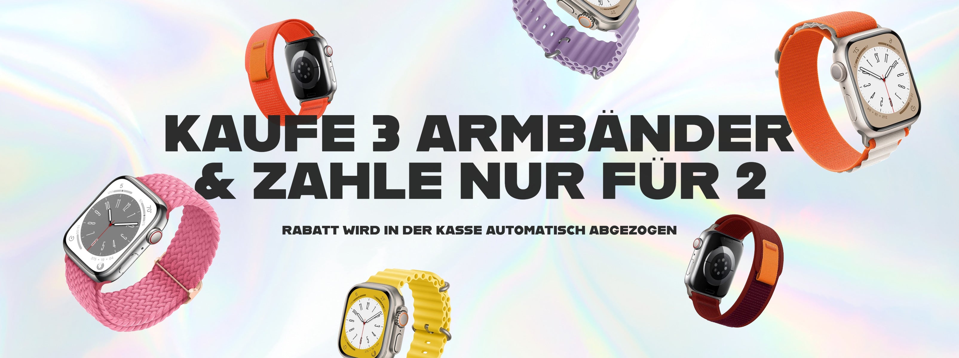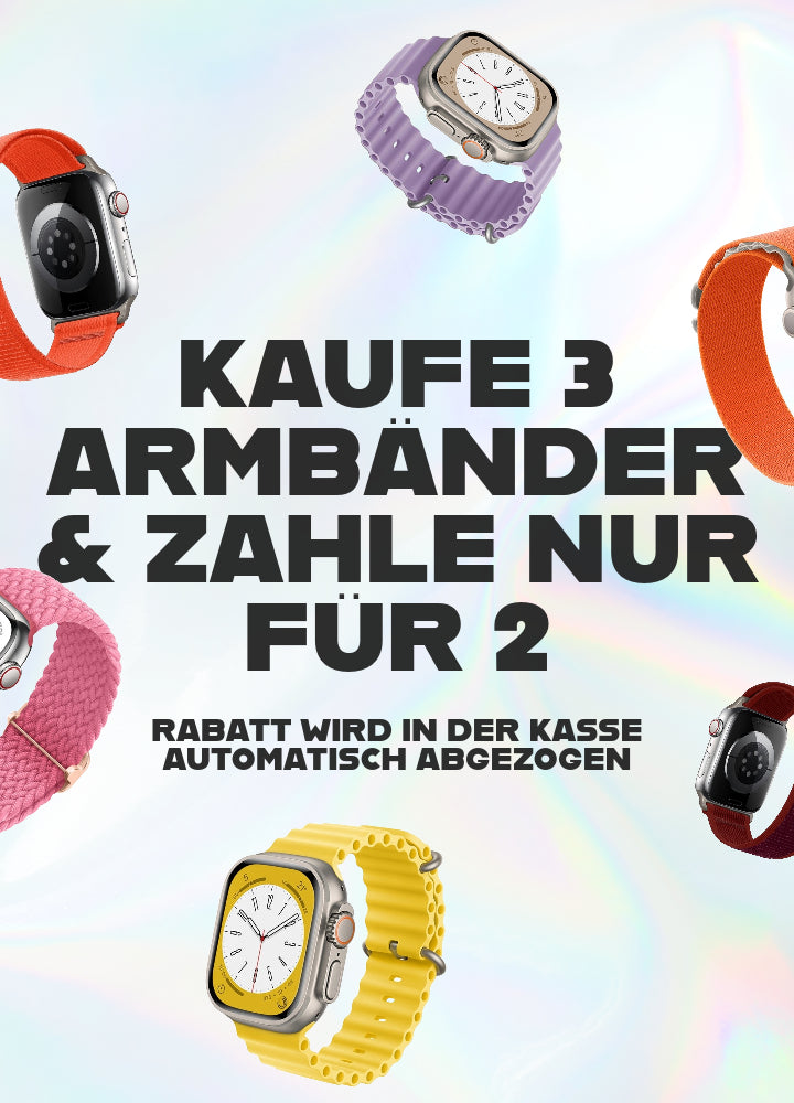 Egal, ob Du nach einemsportlichen Silikonarmband, einemeleganten Lederarmbandoder einemstilvollen Metallarmbandsuchst, es gibt eine Vielzahl von Optionen für die Apple Watch. Stöber durch unser Sortiment undfinde das perfekte Armband für Deine Apple Watch, egal ob es sich um eine Apple Watch Series 1-11, SE 1-3 oder Ultra 1-3, eine Apple Watch 44mm oder eine andere Größe handelt. Mit den richtigen Armbändern kannst Du Deine Apple Watch personalisieren und ihr einen ganz eigenen Stil verleihen.